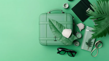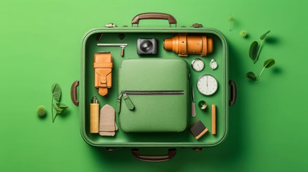 Green travel suitcase with accessories on green background. Flat lay, top view