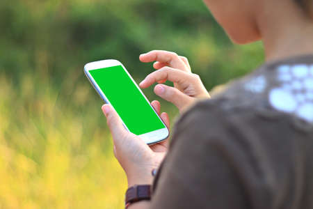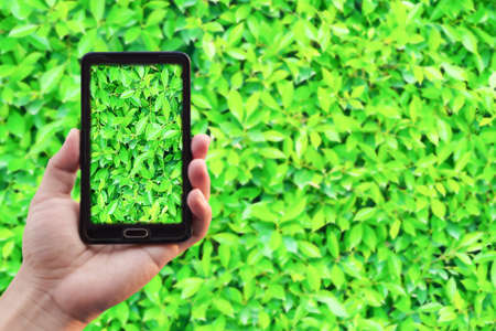 Woman hand using smartphone beautiful nature tropical green background. Business, financial, trade stock maket and social network concept.
