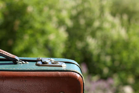 leather retro suitcase on a blurred background of nature / warm time for travel