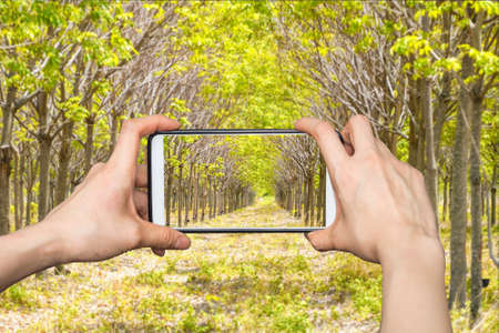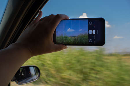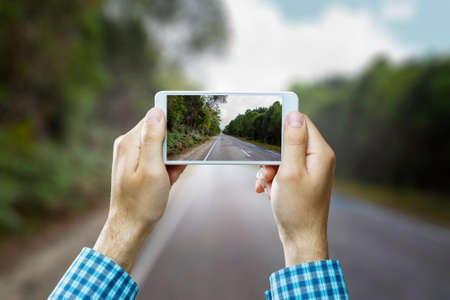 Smartphone screen: Taking photo on smart phone with nature background. Travel and adventure concept.