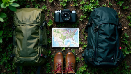 Flat lay of hiking and camping essentials on dark green forest background. Includes boots, backpacks, map, cameras and travel mug. Items for outdoor adventures. Travel kit banner