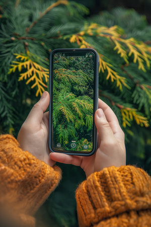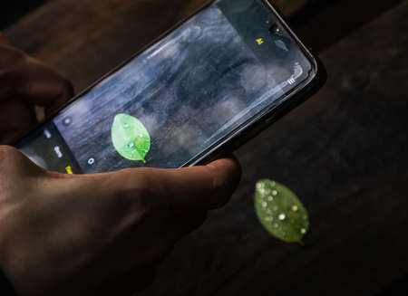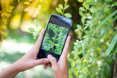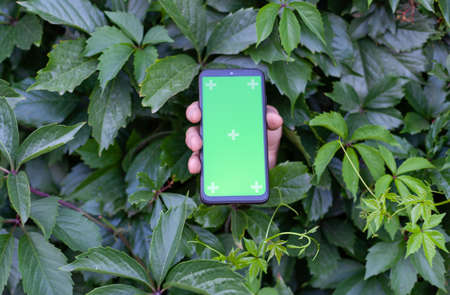 Female hands hold a smartphone for photography on a background of dense thickets of bush. Taking the texture of nature for memory while traveling. Taking a picture with a smart phone concept
