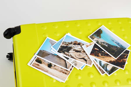 Photos of resorts on large suitcase. Different pictures on wheeled suitcases close up.