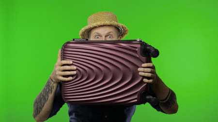 Portrait of man tourist hides behind a suitcase and looks out. Handsome man in blue shirt and hat. Place for your logo or text. Chroma key. Green screen