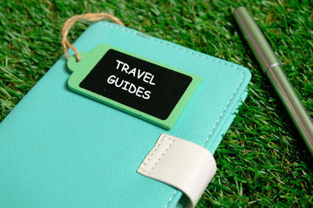A book with blackboard written with 'TRAVEL GUIDES' with pen on grass background.