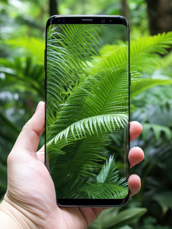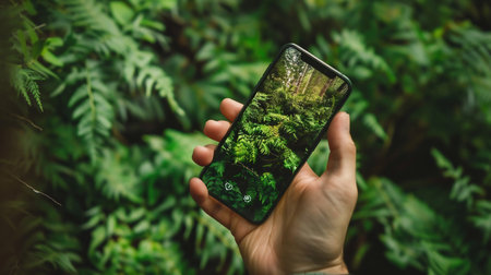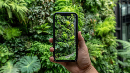 A person holds a smartphone in front of a vibrant green living wall. The phone screen shows a close-up of the wall's rich foliage, capturing nature in a city environment.