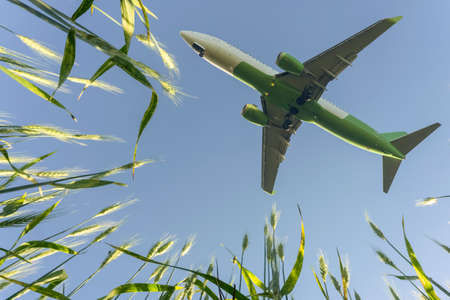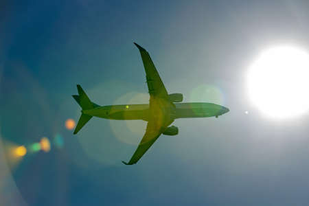 Airplane flight on the blue summer sky. Takeoff or landing of a passenger plane with traveling tourists. Air travel and travel industry concept. high quality photo