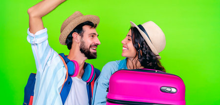 Traveling couple. Man and woman with backpack and suitcase isolated on green background. Travelers about to leave on vacation.