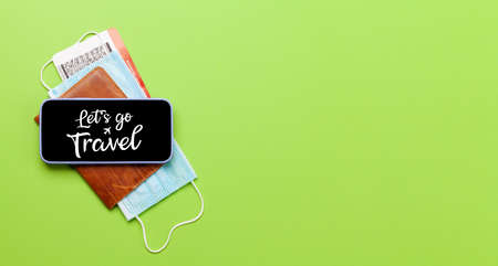 Travel and vacation concept. Smartphone over passport with plane ticket and face protection mask. Top view flat lay with copy space