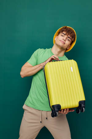a cute, happy man stands on a green background, dressed in a yellow panama hat, holding a bright travel suitcase in his hand, lifting it.