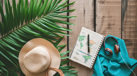 Top view of travel planning concept. Notebook, sunglasses and palm leaf on white background.