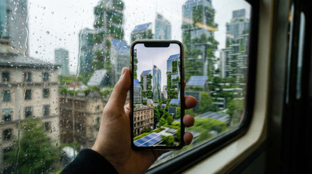 A hand holding a smartphone taking a photo of the city outside, the city features skyscrapers covered in greenery and solar panels