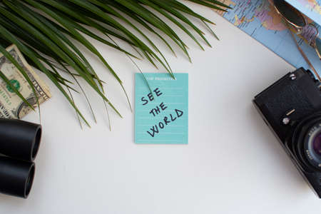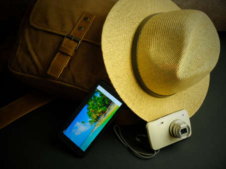 Travel bag, camera, travel map and Panama hat ready for next adventure