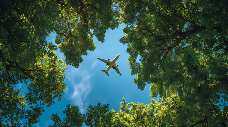 Aerial perspective of an airplane above a vibrant green rain forest, showcasing a healthy environment and nature's landscape.