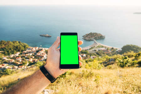 Mans hand holds a smartphone with a blank screen vertically on the background of island