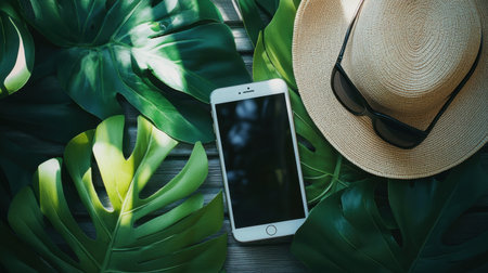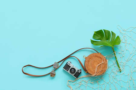 Summer sunny background with green leaves in the first plan against a blurred image of the camera, sunglasses, straw hat and leaf shadows. Concept of vacation, travel. Top view with copy space. Flat lay. Image
