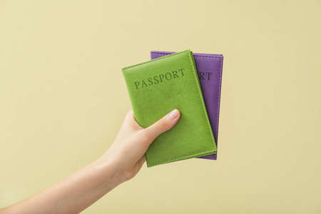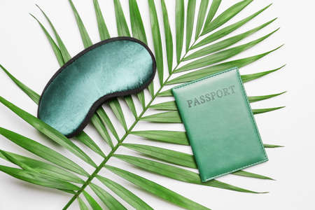 Passport, earrings, wooden plane and palm leaves on yellow background