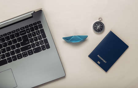 travel concept. Laptop and Origami paper boats, compass, passport on beige background