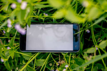 human hand hold black blank screen for text on smart phone, tablet, cellphone with walk way in garden, take photo.