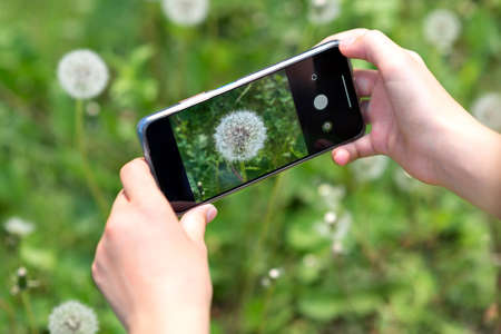 Girl taking photo of dandelion by smartphone. Summer activity in a nature. Nature-study. Allergy season.