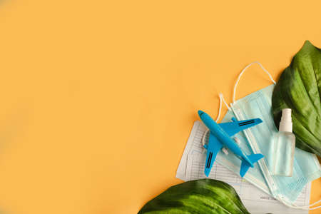 Toy airplane, hand sanitizer and face medical mask on yellow background. Travel during the coronavirus pandemic concept. Copy space for your text