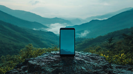 A smartphone with a blank screen placed on a rocky surface, set against a scenic mountain landscape with blurred peaks and vegetation.