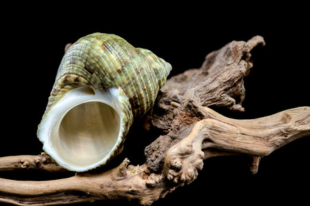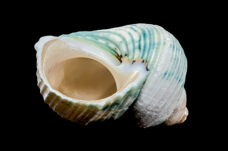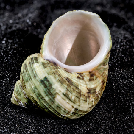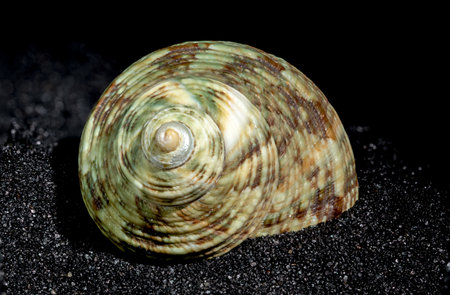Turbinidae lunella undulata seashell on a black sand background close-up