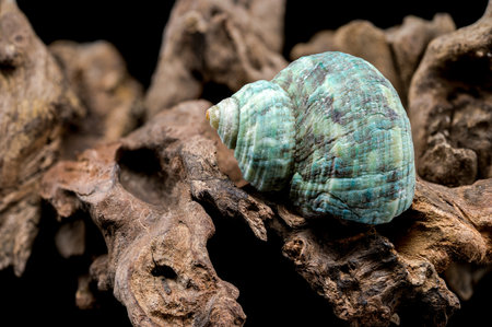 A striking Turbo cornutus snail with distinctive horn-like spikes rests on a piece of weathered driftwood. This image highlights the unique features and intricate details of this marine species