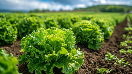 Lush, bright-leafed lettuce thrive in orderly rows across a fertile, sunlit field, epitomizing healthy growth during peak cultivation in an expansive farmland setting.