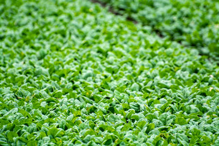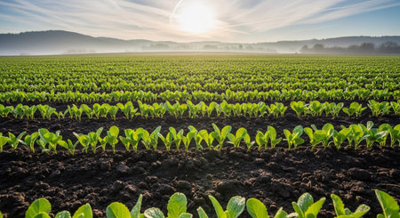 Straight rows of sugar beets growing in a soil in perspective on an agricultural field. Sugar beet cultivation. Young shoots of sugar beet, illuminated by the sun. Agriculture, organic.