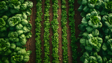 Aerial view of lush rows of fresh organic vegetables on a farm, showcasing vibrant greenery and the beauty of agricultural practices promoting health and sustainability.