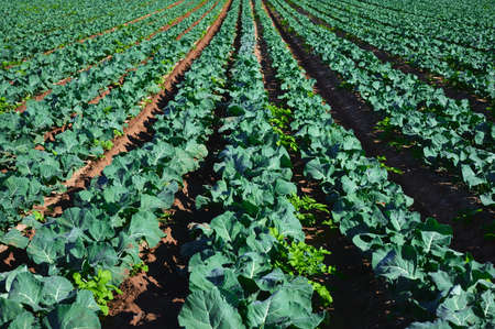 Growing plants of cabbage Ñ–n a bed rows red soil on a farmland. Concept farming, food production.