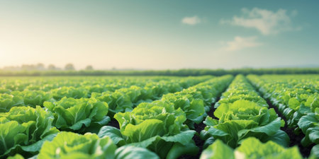 Expansive field of vibrant green lettuce heads stretching to the horizon under a beautiful blue sky with wispy clouds. A serene and productive agricultural scene showing fresh produce.