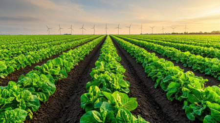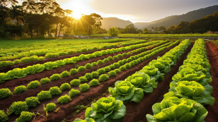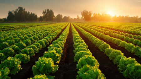A breathtaking view of lush green lettuce rows stretching across an expansive agricultural field at sunset, showcasing nature's beauty and farming vitality.