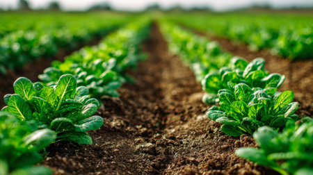 AI Generated. Fresh green lettuce growing in rows on farm field