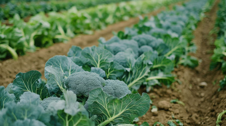 Lush rows of fresh green broccoli thriving in a cultivated field. This image showcases healthy vegetables growing under optimal farming conditions, perfect for promoting organic produce.