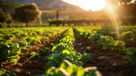 A stunning view of vibrant vegetable fields during sunrise, showcasing rows of fresh produce thriving in rich soil, highlighting the beauty of agriculture.