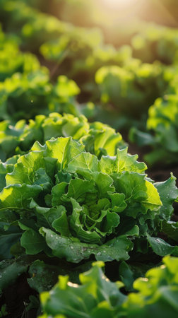 A field of green lettuce plants. The sun is shining on the plants, making them look fresh and healthy