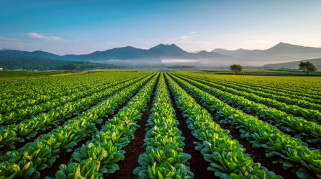 This stunning stock photo captures a vibrant cabbage field under a hazy morning light. Rolling hills create a serene backdrop, showcasing agricultural beauty in nature.