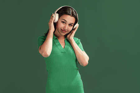 Portrait of beautiful young girl listening to music in headphones, posing isolated over green studio background. Concept of emotions, facial expression, lifestyle, fashion, youth culture