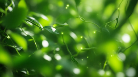 A soft-focus macro view of delicate green leaves and thin twigs, interspersed with small, glowing golden specks of light and a bokeh effect.