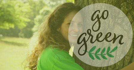 Image of go green text over caucasian woman embracing tree. Recycle week, ecology and celebration concept digitally generated image.