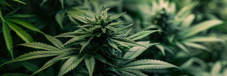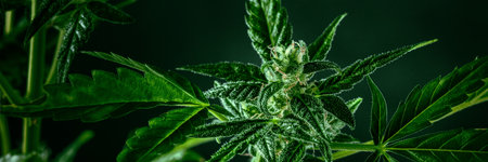 Cannabis plant with green leaves and white flowers, with trichomes, panorama. Growing organic medicinal marijuana indoors for CBD panoramic banner