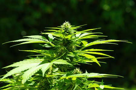 Marijuana or hemp at the beginning of flowering. Close-up shot. Medical weed growing. THC in health care