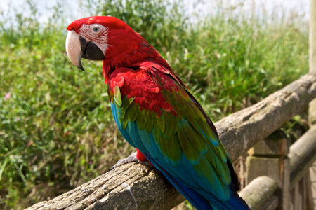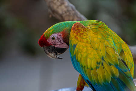Beautiful colorful macaw parrot sitting on a branch in the park