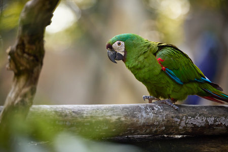 Military macaw close portrait perched looking forward sharp feathers and beak blurred light background with soft wooden branch natural exotic wildlife moment.