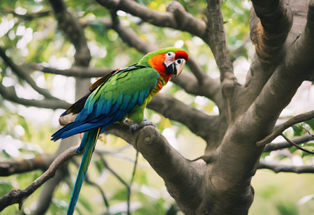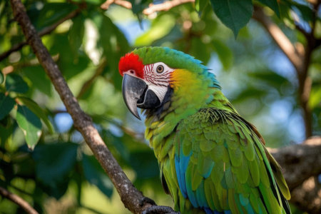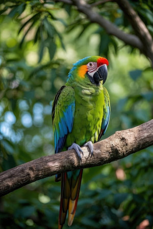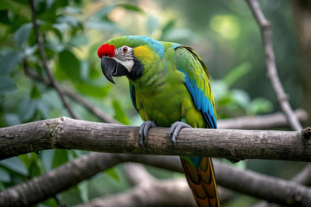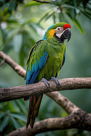 A great green macaw perched on a branch in the rainforest. Stunning wildlife photography of this beautiful and endangered bird species.