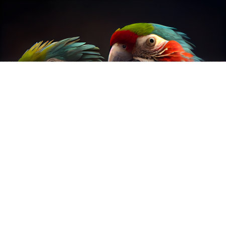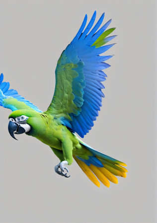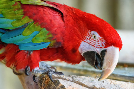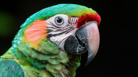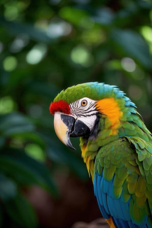 A detailed close-up presents a vibrant macaw parrot, showcasing rich greens, blues, and oranges in its plumage. The image emphasizes the bird's eye and beak, with a soft background suggesting an outdoor environment. This image is suitable for various commercial uses, including editorial content and design projects.