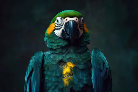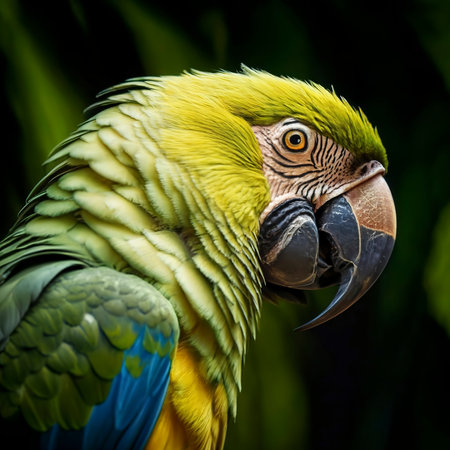 Portrait of a beautiful green Amazon parrot with yellow and blue plumage, set against a dark, blurred natural background.