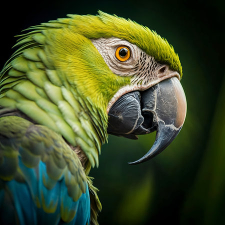 A detailed image presents a parrot's head, showcasing vibrant green, blue, and yellow feathers. The bird's eye is sharply in focus, highlighting the intricate patterns and textures. The composition appears natural, likely taken outdoors with soft lighting. Suitable for use in various editorial and commercial projects.